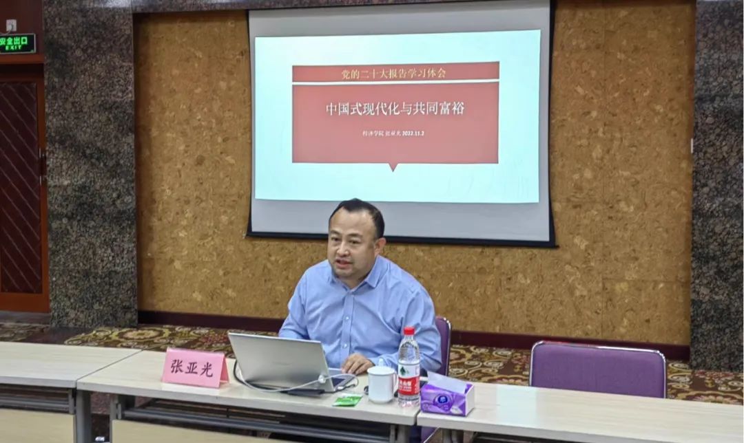 會(huì)上,張亞光副院長(zhǎng)圍繞黨的二十大報(bào)告,為大家作了以“中國(guó)式現(xiàn)代化與共同富裕”為題的報(bào)告,從中國(guó)共產(chǎn)黨對(duì)中國(guó)式現(xiàn)代化的理論貢獻(xiàn)、二十大報(bào)告對(duì)中國(guó)式現(xiàn)代化理論的升華及從思想史角度看共同富裕的理論與實(shí)踐三個(gè)方面,對(duì)中國(guó)式現(xiàn)代化和共同富裕進(jìn)行了充分的介紹與解讀,并結(jié)合當(dāng)下經(jīng)濟(jì)形勢(shì)進(jìn)行了較為深入的分析。