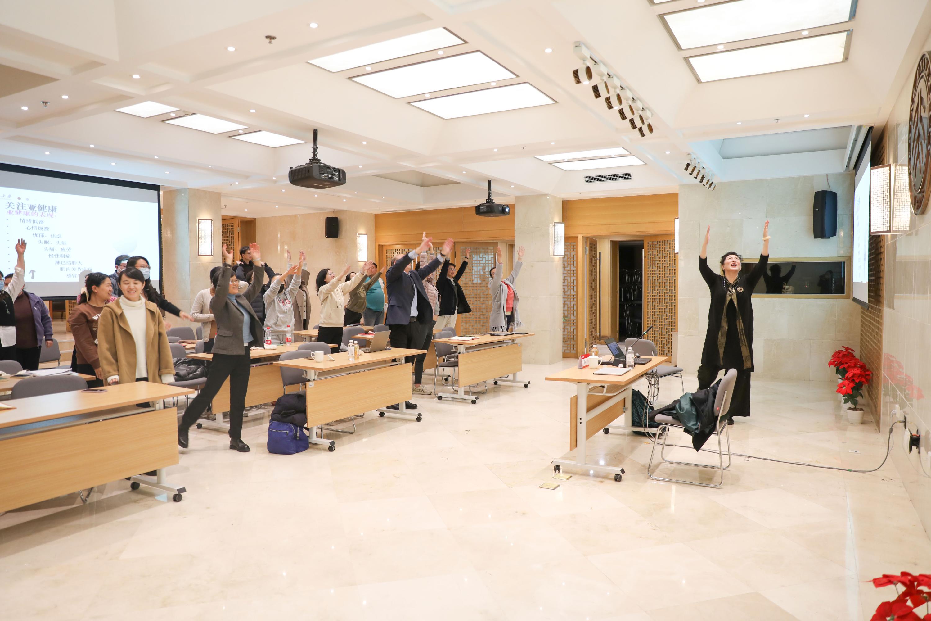 張銳教授分享了不同年代和不同理論體系內(nèi)對于“健康”定義的不斷演變,講述了現(xiàn)代醫(yī)學觀點中健康應(yīng)包含身體健康、精神健康、社會交往健康等多重要素,并從飲食營養(yǎng)、行為營養(yǎng)和心理營養(yǎng)等多維度給出了建議,呼吁在場學員們充分認識到健康管理的積極意義。此外,張教授還指出生命在于運動,運動需要科學。科學的身體活動可以預防疾病,愉悅身心,促進健康。她邀請學員進行減重經(jīng)驗分享,現(xiàn)場教授了針對久坐不動人群在辦公室即可練習的拉伸動作,并帶領(lǐng)全體學員進行了練習。通過深入淺出的講解,學員們意識到定期適量進行身體活動有助于預防和改善慢性病,并能促進精神健康、提高生活質(zhì)量和幸福感,傳播積極健康的生活方式、促進社會和諧發(fā)展。