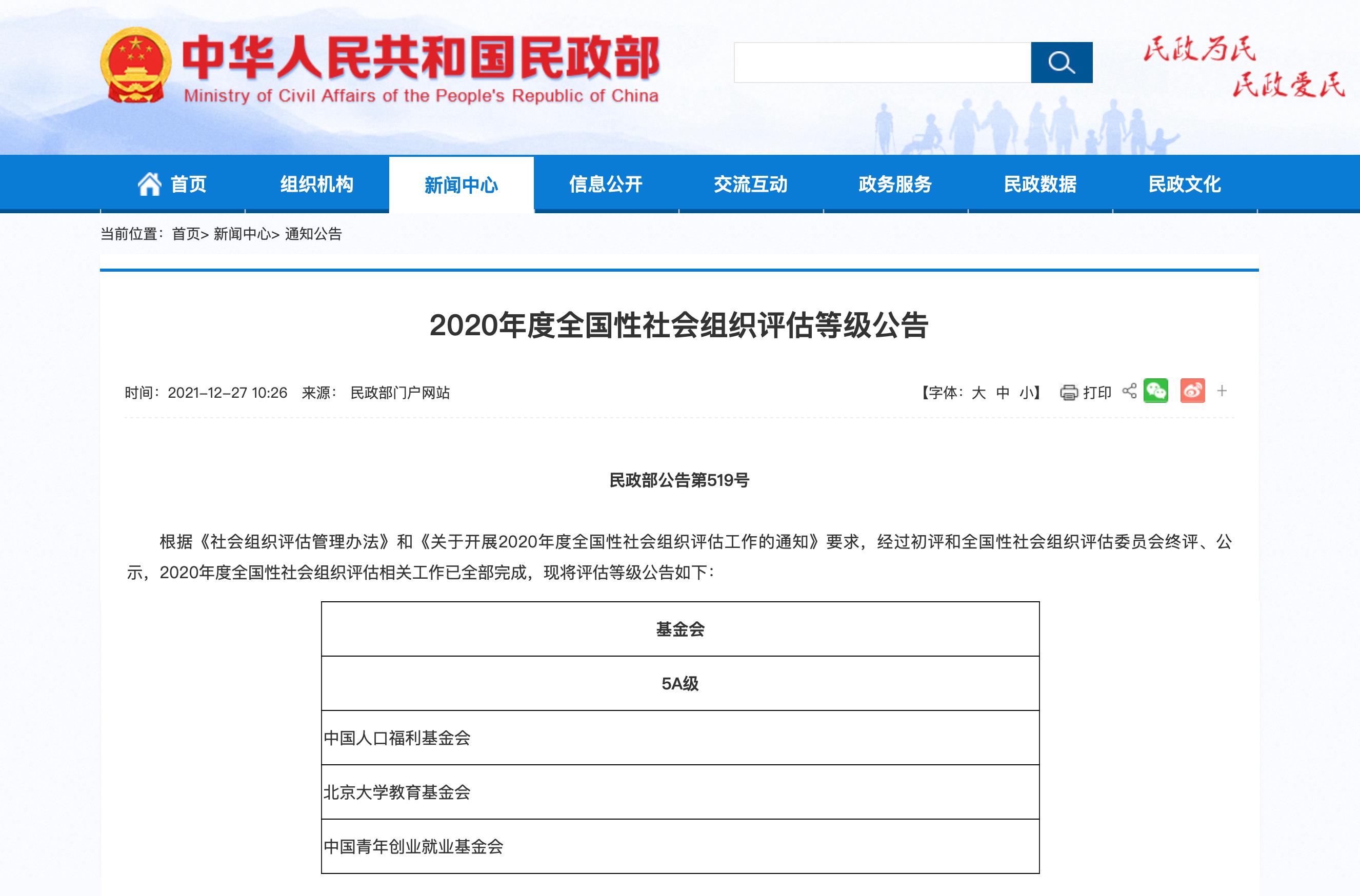 2021年12月24日,民政部發(fā)布2020年度全國(guó)性社會(huì)組織評(píng)估等級(jí)公告,北京大學(xué)教育基金會(huì)再次被評(píng)為最高等級(jí)——5A級(jí)基金會(huì)。