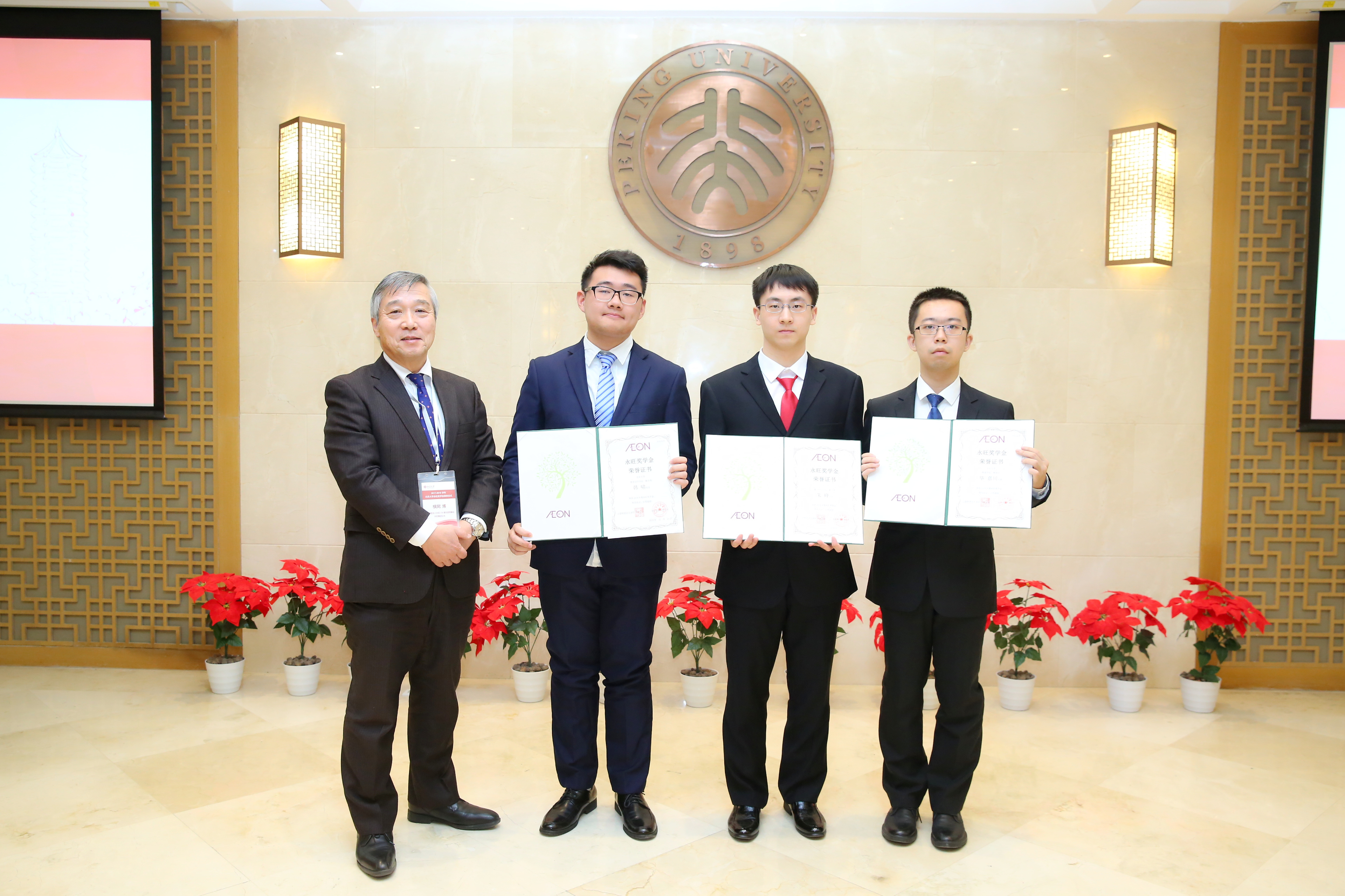 12月21日,2017-2018學(xué)年度北京大學(xué)永旺獎(jiǎng)學(xué)金頒獎(jiǎng)儀式在教育基金會(huì)北大之友報(bào)告廳舉行。公益財(cái)團(tuán)法人永旺1%俱樂(lè)部理事長(zhǎng)兼永旺集團(tuán)議長(zhǎng)橫尾博、永旺商業(yè)有限公司董事總經(jīng)理椎名孝夫、天津永旺小額貸款有限公司董事總經(jīng)理永島秀樹、永旺幻想(中國(guó))兒童游樂(lè)有限公司董事長(zhǎng)兼總經(jīng)理池田宏次郎、公益財(cái)團(tuán)法人永旺1%俱樂(lè)部事務(wù)局長(zhǎng)本田陽(yáng)生等蒞臨燕園,與北京大學(xué)教育基金會(huì)秘書長(zhǎng)李宇寧,學(xué)生工作部副部長(zhǎng)、學(xué)生獎(jiǎng)勵(lì)獎(jiǎng)學(xué)金評(píng)審委員會(huì)秘書長(zhǎng)樊志和獲獎(jiǎng)學(xué)生共同出席活動(dòng)。頒獎(jiǎng)儀式由教育基金會(huì)項(xiàng)目部部長(zhǎng)禹潔主持。