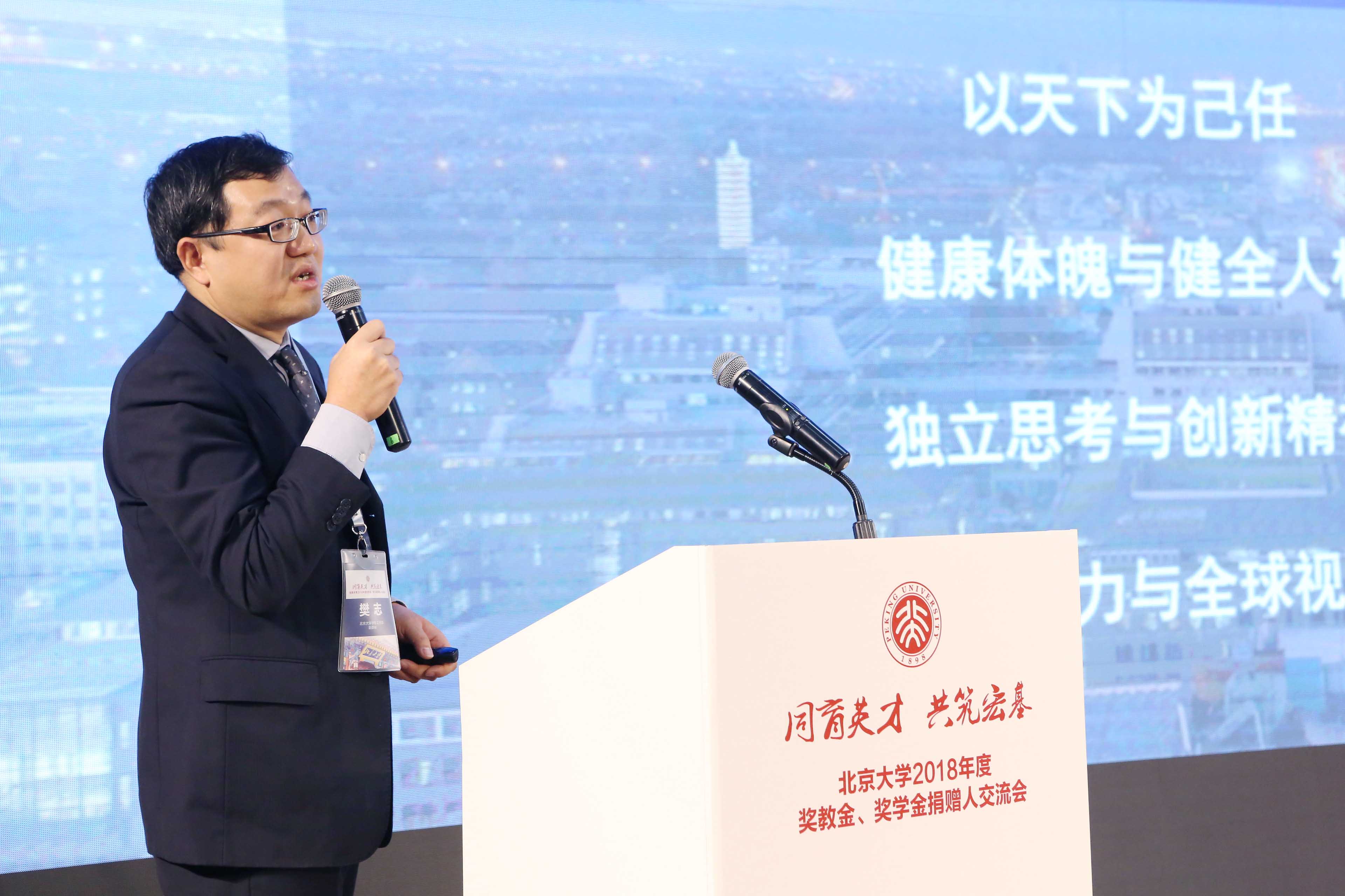 在全場熱烈的掌聲中,王博副校長、劉波部長、李宇寧秘書長分別為獎教金、獎學金捐贈方代表頒發(fā)2018年度北京大學育人貢獻獎。