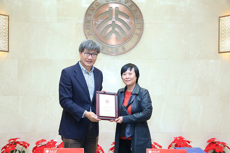 在全場熱烈的掌聲中,王明舟社長和李宇寧秘書長共同簽署捐贈協(xié)議。王博副校長向北大出版社頒發(fā)杰出教育貢獻獎,金娟萍書記代表領(lǐng)獎。