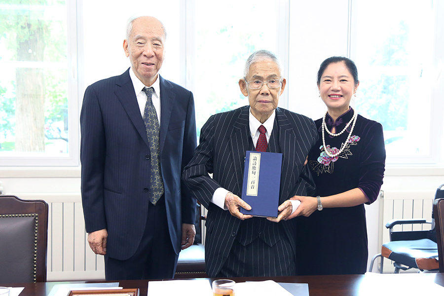 座談會后,袁教授向馮先生贈送了自己的著作——《論詩絕句一百首》,全體人員在大雅堂前合影留念。