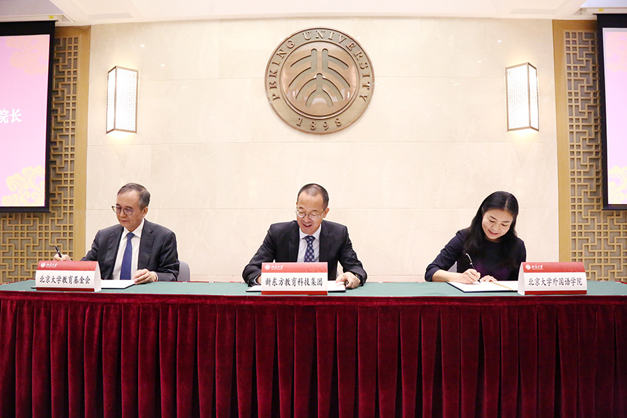 新東方教育科技集團(tuán)董事長俞敏洪校友,新東方公益基金會(huì)秘書長王學(xué)文,新東方教育科技集團(tuán)總裁辦公室主任金鈺,與北京大學(xué)校長林建華,外國語學(xué)院院長寧琦、黨委書記李淑靜,教育基金會(huì)秘書長李宇寧、副秘書長耿姝、胡俊等共同出席。副校長、教育基金會(huì)副理事長王博主持儀式。