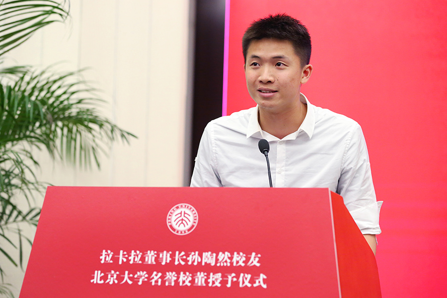 孫陶然校友表示,在北大四年的學(xué)習(xí)生活為自己帶來(lái)了四筆受益終生的財(cái)富,即自信、圈子、學(xué)習(xí)能力和眼界,正是這些成就了今天的自己。他認(rèn)為在“窮則獨(dú)善其身,達(dá)則兼濟(jì)天下”的理念之下,應(yīng)該為母校、為社會(huì)做出貢獻(xiàn)。孫陶然校友對(duì)于獲得北京大學(xué)名譽(yù)校董這個(gè)新的身份感到非常榮幸,他認(rèn)為這是對(duì)他的一份激勵(lì),更是對(duì)已走出北大和正在北大學(xué)習(xí)的全體北大人的一份激勵(lì),是希望大家能夠更有作為,更多地關(guān)注和回饋母校。孫陶然校友表示,這個(gè)新的身份將是他未來(lái)心向母校和為母校做出更多貢獻(xiàn)的開始。