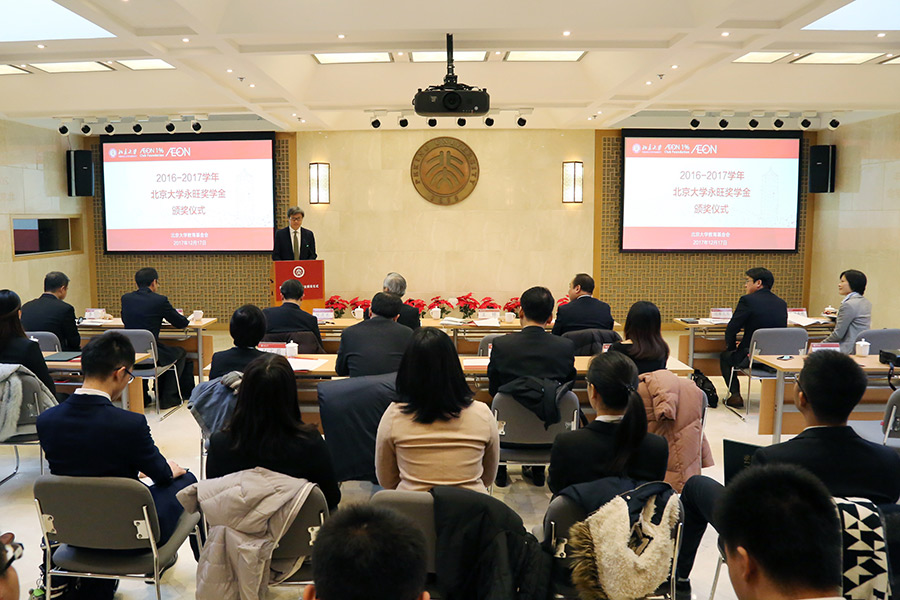 12月17日,2016-2017學(xué)年北京大學(xué)永旺獎(jiǎng)學(xué)金頒獎(jiǎng)儀式在教育基金會(huì)北大之友報(bào)告廳舉行。公益財(cái)團(tuán)法人永旺1%俱樂(lè)部理事長(zhǎng)兼永旺(株)董事會(huì)議長(zhǎng)橫尾博、北京永旺商業(yè)有限公司董事總經(jīng)理古澤康之、永旺信貸財(cái)務(wù)(亞洲)有限公司執(zhí)行董事細(xì)川徹、永旺(中國(guó))投資有限公司管理本部長(zhǎng)近藤良策、公益財(cái)團(tuán)法人永旺1%俱樂(lè)部事務(wù)局副局長(zhǎng)山崎美穗蒞臨燕園,與北京大學(xué)副校長(zhǎng)、教育基金會(huì)副理事長(zhǎng)王博,學(xué)生工作部部長(zhǎng)張慶東,學(xué)生工作部副部長(zhǎng)、學(xué)生獎(jiǎng)學(xué)金評(píng)審委員會(huì)秘書(shū)長(zhǎng)樊志,教育基金會(huì)副秘書(shū)長(zhǎng)趙文莉以及全體獲獎(jiǎng)學(xué)生共同出席。頒獎(jiǎng)儀式由教育基金會(huì)秘書(shū)長(zhǎng)李宇寧主持。