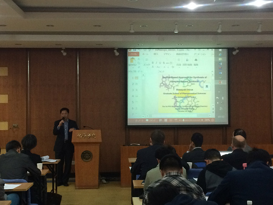 10月21-23日,首屆“北京大學(xué)藥明康德有機(jī)化學(xué)講座”在化學(xué)與分子工程學(xué)院成功舉辦。會(huì)議邀請(qǐng)了中國(guó)科學(xué)院上海有機(jī)化學(xué)研究所唐勇院士、海德堡大學(xué)A. Stephen K. Hashmi教授、俄勒岡大學(xué)Michael M. Haley教授、慕尼黑大學(xué)Dirk Trauner教授和東京大學(xué)Masayuki Inoue教授等五位國(guó)際著名教授前來講學(xué)。北京大學(xué)化學(xué)學(xué)院席振峰院士等多位教授以及藥明康德新藥開發(fā)公司國(guó)內(nèi)新藥研發(fā)服務(wù)副總裁黎健博士和化學(xué)醫(yī)藥部執(zhí)行理事錢文遠(yuǎn)博士等共同參加研討會(huì)。黎健博士在開幕式上致歡迎詞。本次學(xué)術(shù)研討會(huì)吸引了北京大學(xué)化學(xué)學(xué)院、北京大學(xué)藥學(xué)院及其他兄弟院校100余名教授、研究員、博士后和研究生的積極參與。