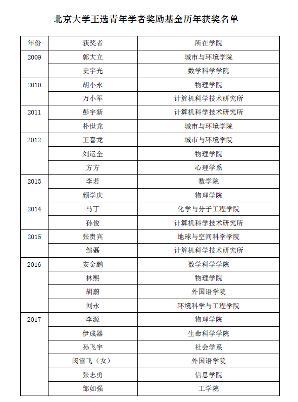 “源自北大,回饋北大”是王選教授生前所倡導(dǎo)的一貫宗旨。2008年,為支持北京大學(xué)建設(shè)高水平的教師隊(duì)伍,培養(yǎng)具有卓越創(chuàng)新能力的后備骨干人才,促進(jìn)學(xué)校教學(xué)科研事業(yè)的大力提升,王選教授的夫人陳堃銶教授代表北京大學(xué)計(jì)算機(jī)科學(xué)技術(shù)研究所捐資在北大設(shè)立“北京大學(xué)王選青年學(xué)者獎(jiǎng)勵(lì)基金”,用于獎(jiǎng)勵(lì)校本部理工科、人文社科教學(xué)科研單位在教學(xué)崗位和科研工作中做出重要貢獻(xiàn)并具有巨大發(fā)展?jié)摿Φ那嗄杲處煛_@是北大最早針對(duì)青年學(xué)者所設(shè)的獎(jiǎng)勵(lì)基金,至今累計(jì)獎(jiǎng)勵(lì)教師25名。