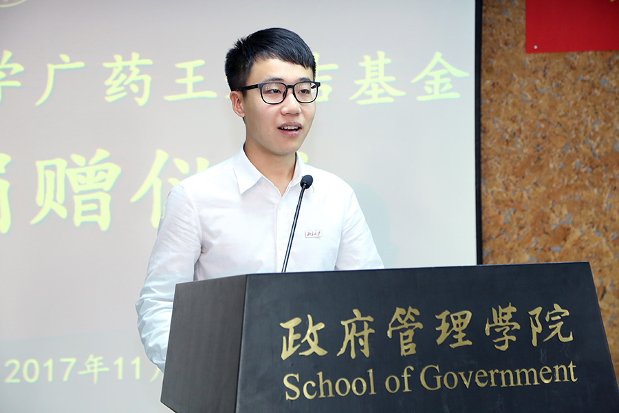 北京大學(xué)學(xué)生會(huì)主席、工學(xué)院2014級(jí)本科生孫北奇作為學(xué)生代表感謝廣藥集團(tuán)對(duì)青年一輩的關(guān)懷和對(duì)國家教育事業(yè)發(fā)展的高度支持。他相信基金的設(shè)立將助力北大學(xué)子成長(zhǎng)成才,開拓學(xué)生的國際視野,推進(jìn)校園活動(dòng)的順利開展,全面提高學(xué)生的綜合素質(zhì),為國家發(fā)展培育高素質(zhì)的人才。