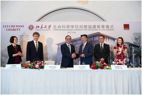11月8日,林建華校長(zhǎng)一行出席了“北京大學(xué)生命科學(xué)學(xué)院捐贈(zèng)協(xié)議簽署儀式”。嘉華集團(tuán)主席及創(chuàng)辦人呂志和博士宣布向北京大學(xué)捐資1.2億元,設(shè)立“呂志和生命科學(xué)學(xué)院基金”,主要用于建設(shè)北京大學(xué)生命科學(xué)科研大樓,支持生命科學(xué)學(xué)院的發(fā)展。為紀(jì)念呂志和博士的巨大貢獻(xiàn),為呂志和博士頒授“北京大學(xué)杰出教育貢獻(xiàn)獎(jiǎng)”,將在2018年初全面落成并投入使用的北京大學(xué)生命科學(xué)科研大樓也被命名為“呂志和樓”。林建華校長(zhǎng),副校長(zhǎng)、教育基金會(huì)副理事長(zhǎng)王博,分別代表北京大學(xué)、北京大學(xué)教育基金會(huì)與呂志和博士共同簽署捐贈(zèng)協(xié)議。生命科學(xué)學(xué)院院長(zhǎng)吳虹教授,教育基金會(huì)秘書長(zhǎng)、校友會(huì)秘書長(zhǎng)李宇寧,校長(zhǎng)辦公室副主任李航,港澳臺(tái)辦公室副主任王勇,教育基金會(huì)副秘書長(zhǎng)耿姝等共同出席儀式。