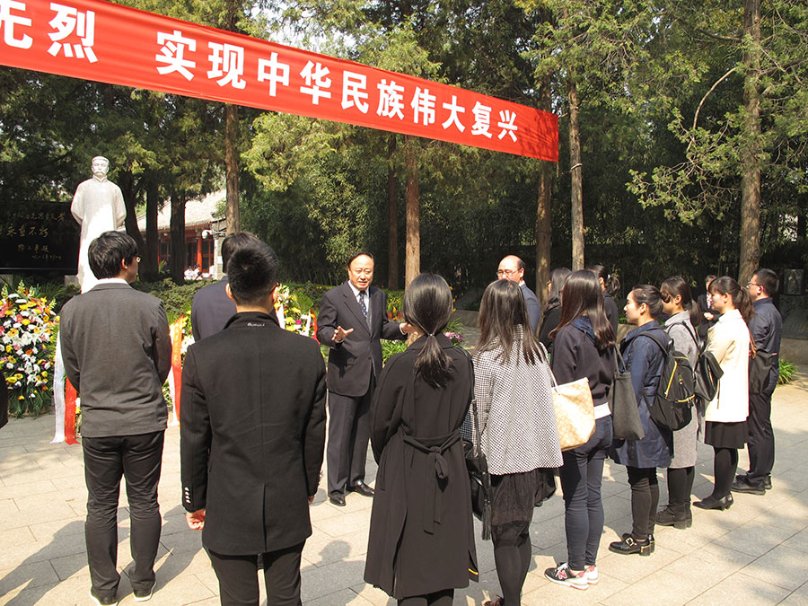 開心今年是李大釗烈士就義90周年, 2017年4月3日,清明節(jié)前夕,北大圖書館黨委、馬克思主義學(xué)院黨委和教育基金會(huì)黨支部共同組織師生黨員代表前往萬安公墓李大釗烈士陵園,開展清明祭奠活動(dòng),深切緬懷偉大的革命先驅(qū)李大釗同志的豐功偉績(jī)。北京大學(xué)教育基金會(huì)理事長(zhǎng)朱善璐參加了活動(dòng)。