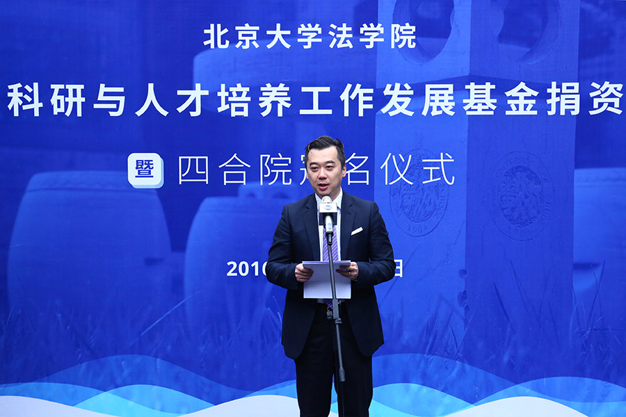捐資儀式上,祁國晟董事長對捐資設(shè)立基金和冠名蔣家胡同四合院深感榮幸。他表示,互聯(lián)網(wǎng)科技的發(fā)展對社會帶來的變革是巨大的,希望利用北京國雙科技有限公司的技術(shù)優(yōu)勢,整合北京大學(xué)的學(xué)術(shù)資源,為中國法律學(xué)科建設(shè)及中國的法治事業(yè)貢獻(xiàn)自己的一份力量。助理總裁石鵬先生作為北大法學(xué)院校友在致辭中回憶了美好的校園時(shí)光和師生情誼,分享了自己的執(zhí)業(yè)經(jīng)歷和創(chuàng)業(yè)體驗(yàn),并鼓勵(lì)在場學(xué)生勇敢創(chuàng)新。