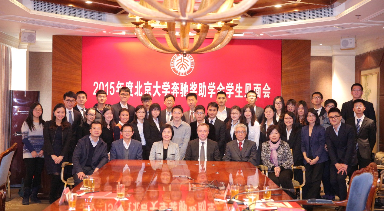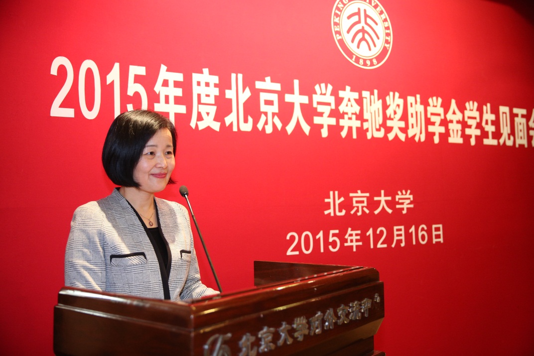 12月16日,北京大學(xué)奔馳獎助學(xué)金學(xué)生交流會在英杰交流中心舉行。戴姆勒大中華區(qū)投資有限公司人力資源執(zhí)行副總裁華德瑞、對外事務(wù)執(zhí)行副總裁李潔、人力資源雇主品牌及招聘負(fù)責(zé)人林艷、北京大學(xué)校長助理、教育基金會秘書長鄧婭、學(xué)生資助中心主任楊愛民、學(xué)生就業(yè)指導(dǎo)中心主任陳永利、學(xué)生工作部副部長劉德英,以及獲獎助學(xué)生代表共同出席。奔馳獎學(xué)金獲獎學(xué)生、2012級中國語言文學(xué)系王蕊和2014級光華管理學(xué)院林心悅主持交流會。