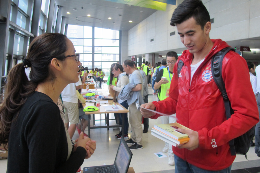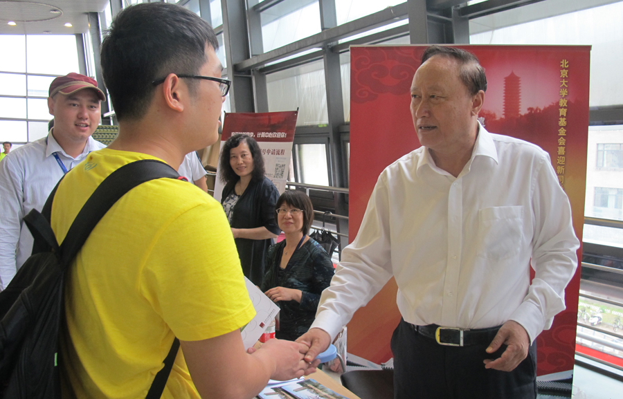 而更讓同學(xué)們?yōu)橹d奮的,是林建華校長和朱善璐書記的先后到來。在基金會的迎新站點前,首次參加迎新活動的林校長親手為一位同學(xué)送上購書卡,貼心的詢問他的情況,勉勵他好好學(xué)習(xí)。朱書記是教育基金會理事長。來到教育基金會的服務(wù)臺時,他直接站到臺后做起愛心服務(wù)工作,讓同學(xué)們倍感欣喜。朱書記詳細(xì)了解了每一位新生的家庭情況,還寄語新生,希望他們能夠把走進(jìn)北大作為人生階段的一個新的開始,把握并珍惜這來之不易的機(jī)會,在這里讓一段美妙的旅程啟航,扣好人生的第一粒扣子。朱書記還叮囑現(xiàn)場的基金會工作人員,加大對困難家庭學(xué)生的資助力度,確保他們在北大享有平等機(jī)會,順利完成學(xué)業(yè)。