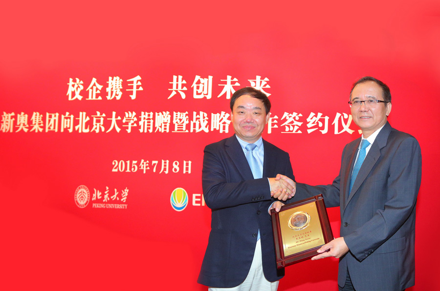 在儀式上,新奧集團董事局王玉鎖主席與林建華校長共同簽署合作協(xié)議,新奧公益慈善基金會韓瑞改理事長與吳志攀常務(wù)副校長共同簽署捐贈協(xié)議。林建華校長代表學(xué)校向王玉鎖先生授予北京大學(xué)名譽校董銅牌,并頒發(fā)杰出教育貢獻獎。學(xué)生代表為王玉鎖先生佩戴校徽并獻花。