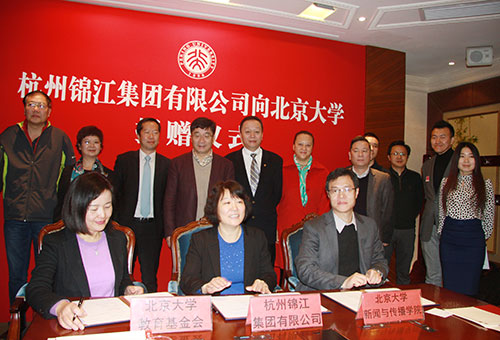 11月19日上午,杭州錦江集團(tuán)有限公司在北京大學(xué)簽署捐贈(zèng)協(xié)議,宣布將參與設(shè)立北京大學(xué)戰(zhàn)略傳播研究基金,支持北大建設(shè)國(guó)際一流的傳播研究智庫(kù)。北京大學(xué)黨委書(shū)記、教育基金會(huì)理事長(zhǎng)朱善璐在捐贈(zèng)儀式開(kāi)始之前會(huì)見(jiàn)了各位來(lái)賓。劉偉常務(wù)副校長(zhǎng)出席儀式并講話。杭州錦江集團(tuán)有限公司總經(jīng)理王元珞女士、北京大學(xué)校長(zhǎng)助理、教育基金會(huì)秘書(shū)長(zhǎng)鄧婭、新聞與傳播學(xué)院院長(zhǎng)陸紹陽(yáng)教授共同簽署了捐贈(zèng)協(xié)議。新聞與傳播學(xué)院程曼麗教授主持儀式。