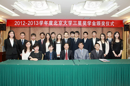 2014年4月30日, 2012—2013學(xué)年度北京大學(xué)三星獎(jiǎng)學(xué)金頒獎(jiǎng)儀式在英杰交流中心舉行。三星電子大中華區(qū)移動(dòng)通信事業(yè)部執(zhí)行副總裁王彤、人力資源部經(jīng)理張愛敬,北京大學(xué)黨委副書記葉靜漪、學(xué)生工作部部長(zhǎng)張慶東、教育基金會(huì)副秘書長(zhǎng)趙文莉、學(xué)生工作部副部長(zhǎng)劉德英出席會(huì)談及頒獎(jiǎng)儀式。
