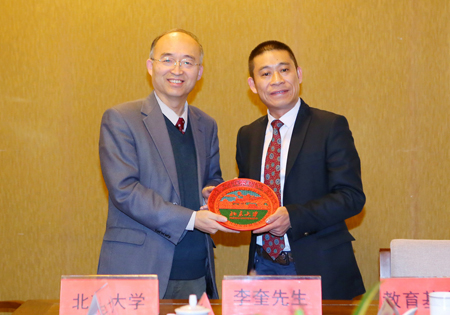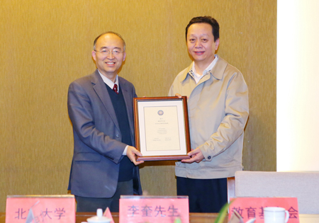 吳志攀常務(wù)副校長、李奎先生以及基金會(huì)秘書長鄧婭代表三方共同簽署了捐贈(zèng)協(xié)議。為表示感謝,吳志攀向基金捐贈(zèng)人李奎和基金發(fā)起人謝建華授予北京大學(xué)教育貢獻(xiàn)獎(jiǎng)。