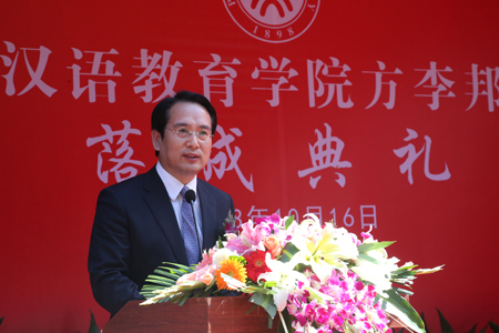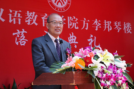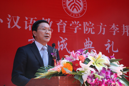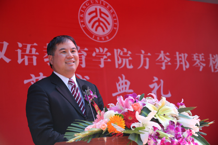 北京大學(xué)校長王恩哥首先致辭,對方李邦琴女士大力支持北大表示衷心感謝。他說,方李邦琴女士多年來為促進兩國友好往來、推進華文教育作出了重要貢獻,為北大建設(shè)付出了心血,是北大最親密的好朋友。正是在她的慷慨支持下,這座人文環(huán)境與自然環(huán)境和諧共生、現(xiàn)代建筑與傳統(tǒng)藝術(shù)相映成趣的大樓才得以建成。他在致辭中表示,學(xué)院大樓的建成將大力改善漢語教學(xué)條件,為漢語教學(xué)和國際推廣事業(yè)提供堅實的支撐。同時,對于北大加快創(chuàng)建世界一流大學(xué),推進國際化進程,進一步全方位推進漢語教學(xué)與文化交流具有重要意義。北大將秉持兼容并包、開放辦學(xué)的胸懷,繼續(xù)提高國際化辦學(xué)水平,為促進文化交流、構(gòu)建和諧世界作出新的貢獻。