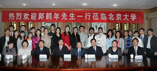 郭鶴年先生一行在學(xué)校領(lǐng)導(dǎo)的陪同下首先來(lái)到臨湖軒。閔維方書記首先代表北京大學(xué)對(duì)郭鶴年先生的來(lái)訪表示熱烈歡迎。他說(shuō),郭先生多年來(lái)默默無(wú)聞地捐資設(shè)立助學(xué)金、捐建學(xué)生食堂和宿舍、資助同學(xué)社會(huì)實(shí)踐,對(duì)北京大學(xué)教育事業(yè)的發(fā)展做出了寶貴的貢獻(xiàn),他代表學(xué)校向郭先生致以崇高的敬意和衷心的感謝,并祝愿郭先生身體健康,常來(lái)北大做客。