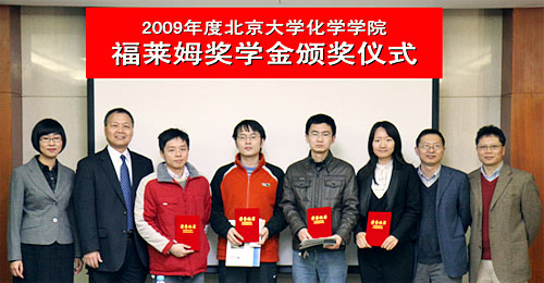 2009年度化學學院研究生福萊姆獎學金頒獎儀式于2010年3月25日在化學學院舉行。福萊姆公司總經(jīng)理、化學學院77級校友劉彤舟博士,化學學院院長高松院士、副院長王劍波教授、黨委副書記馬玉國博士等師生,以及北大教育基金會李榕副秘書長出席了頒獎儀式。