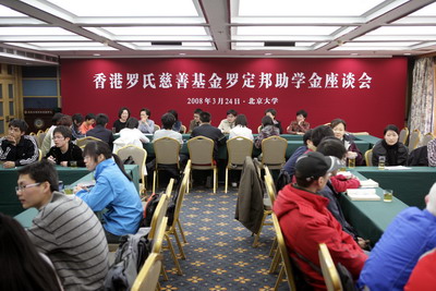 座談會現(xiàn)場 3月24日,香港羅氏慈善基金主席羅嘉穗女士、秘書吳仰明博士一行訪問北京大學,出席了“香港羅氏慈善基金羅定邦助學金座談會”,與獲得2007年度羅定邦助學金的學生見面,并通過破冰游戲、分享討論等方式進行了深入交流。