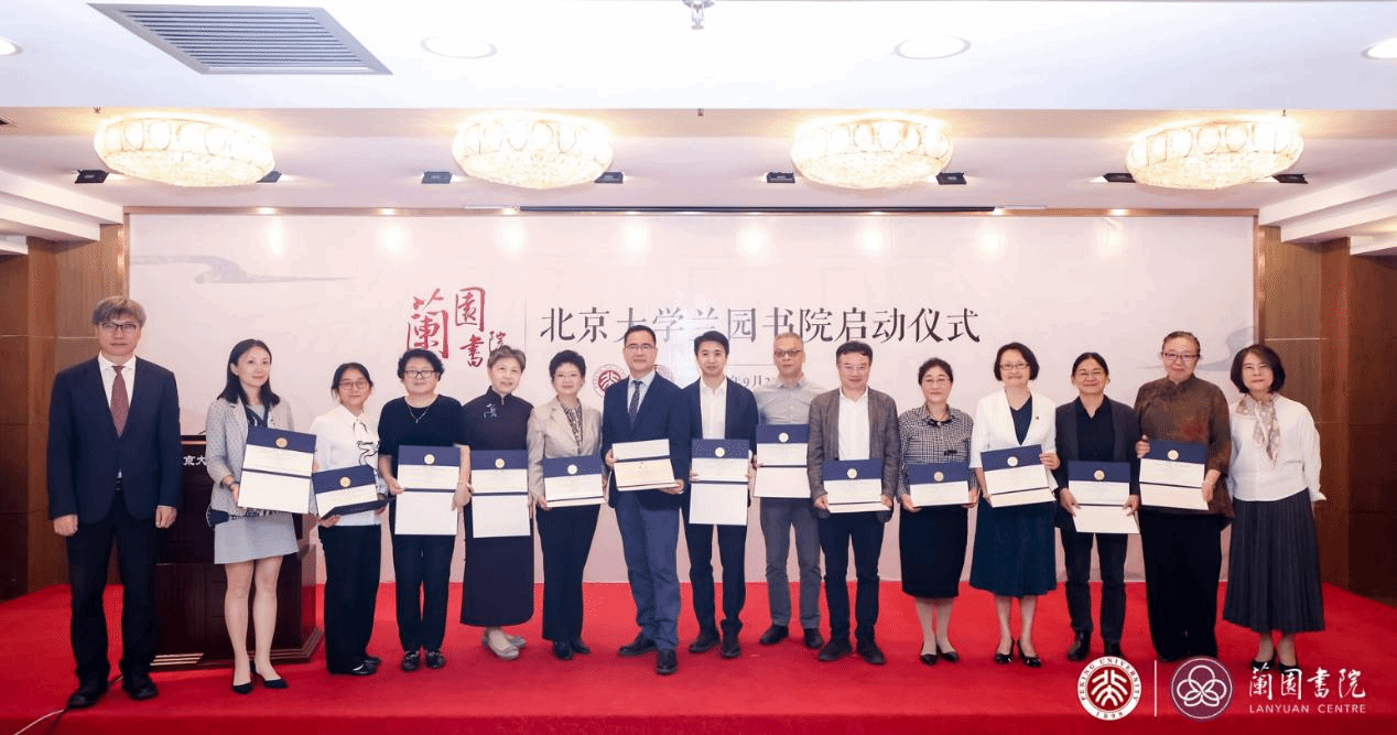 郝平、王博、柯楊、袁明、吳虹、外國(guó)語(yǔ)學(xué)院法語(yǔ)系主任董強(qiáng)教授、蘭園書(shū)院執(zhí)行院長(zhǎng)鄭如青為蘭園書(shū)院揭牌。