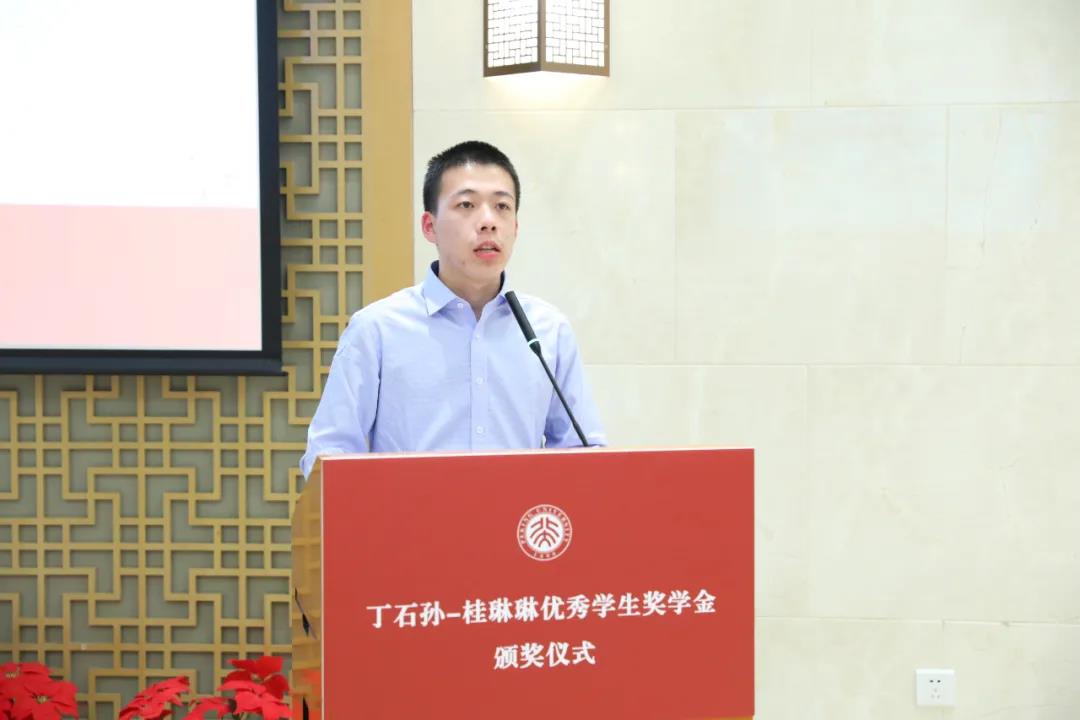 丁干回憶了父母當(dāng)年設(shè)立獎(jiǎng)學(xué)金的想法和囑托。他表示,父母作為幾十年的基礎(chǔ)課教師,特別重視基礎(chǔ)課。“自己從小就在北大校園里成長(zhǎng),無(wú)論北大如何變化,無(wú)論前沿研究如何進(jìn)展,但基礎(chǔ)學(xué)科發(fā)展的基礎(chǔ)不會(huì)變”,這是他和哥哥設(shè)立此項(xiàng)獎(jiǎng)學(xué)金的初衷。他向獲獎(jiǎng)學(xué)生表示衷心祝賀,肯定他們?cè)诨A(chǔ)課上所取得的優(yōu)秀成績(jī),希望這份“不多”的獎(jiǎng)勵(lì)能夠成為大家成長(zhǎng)之路上的里程碑,并為此再接再厲,繼續(xù)前進(jìn)。他也感謝大家為這項(xiàng)獎(jiǎng)學(xué)金的管理和實(shí)施所付出的努力,期待此項(xiàng)獎(jiǎng)學(xué)金能夠一直延續(xù)下去。