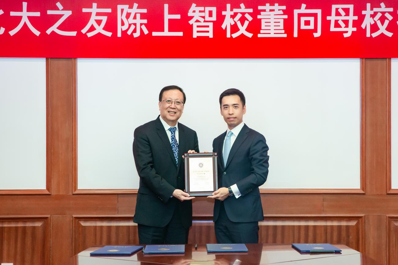 在全場熱烈的掌聲中,陳上智與北京大學(xué)港澳研究院院長陳端洪、教育基金會副秘書長耿姝共同簽署捐贈協(xié)議。郝平代表學(xué)校向陳上智頒授北京大學(xué)杰出教育貢獻(xiàn)獎。
