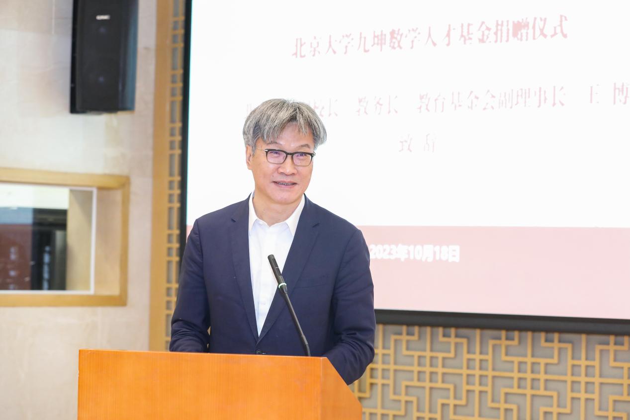 捐贈儀式上,王博代表學(xué)校感謝九坤投資再次慷慨支持北大,體現(xiàn)出九坤投資團隊的遠見卓識和對教育、科技、人才的重視。他指出,北大數(shù)學(xué)開啟了中國現(xiàn)代高等數(shù)學(xué)教育的先河,始終將人才和師資隊伍建設(shè)作為學(xué)科最重要的事業(yè),培養(yǎng)了一批享譽世界的數(shù)學(xué)家和在國際數(shù)學(xué)界屢獲殊榮的“黃金一代”。他表示,數(shù)學(xué)學(xué)科需要的是“人”和“耐心”,相信九坤投資的支持將為數(shù)學(xué)學(xué)科進一步培育人才和取得更大成就提供更強的助力和動力,希望數(shù)學(xué)學(xué)科用好善款,不負厚愛,以優(yōu)異的成績凸顯出校友支持對北大發(fā)展所發(fā)揮的重要作用。