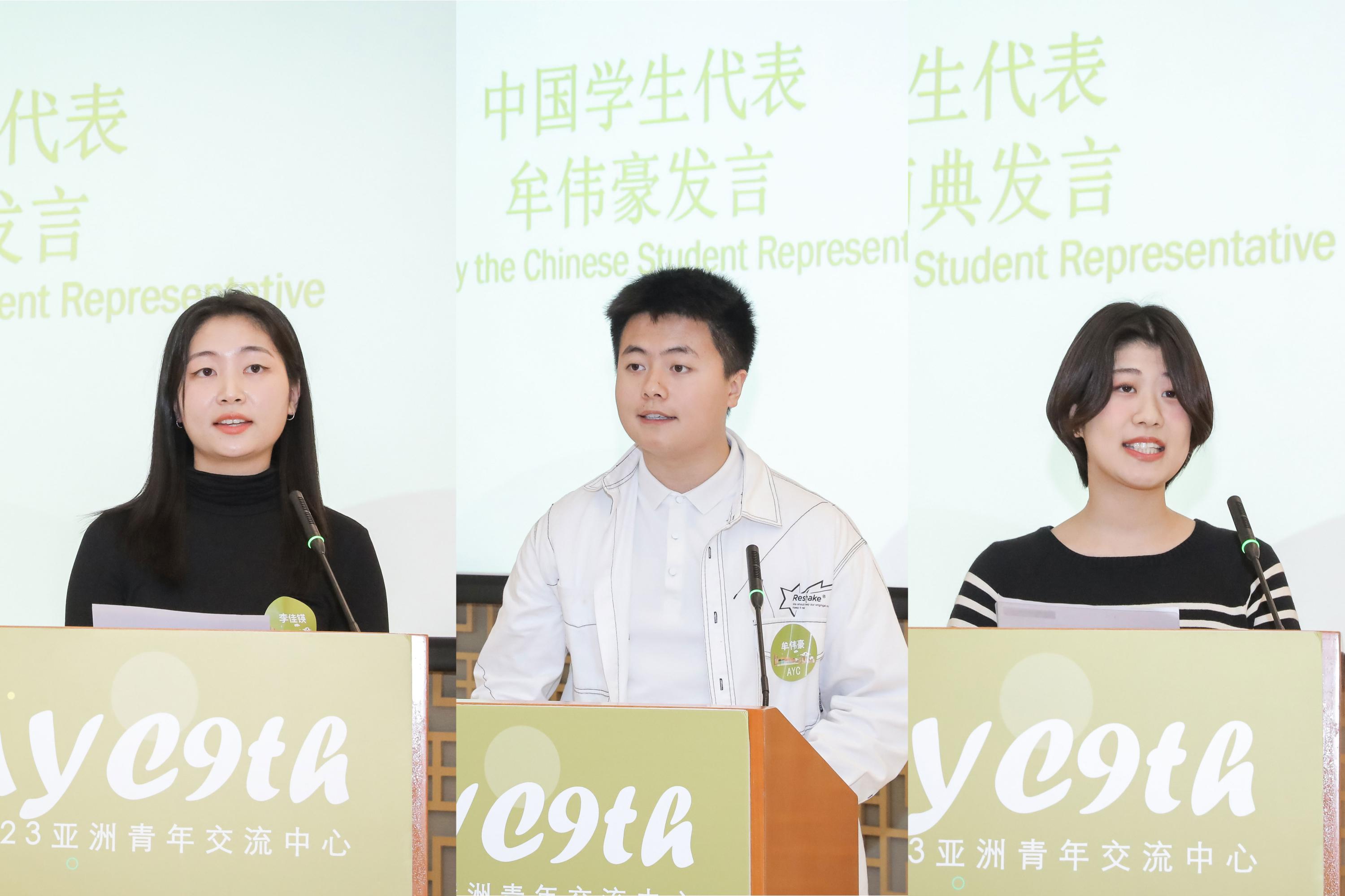 學生代表、來自中國的物理學院2021級本科生牟偉豪,來自日本的對外漢語教育學院交換生岡本莉典,來自韓國的國際關(guān)系學院交換生李佳锳在發(fā)言中感謝亞青項目提供的寶貴資源和老師們的辛勤付出,讓來自亞洲的同學們得以相聚于此、共同成長。他們表示,希望通過對話和交流實現(xiàn)真正的理解和有效的合作,更真實地認識中國,共同擁抱亞洲和世界的美好明天。