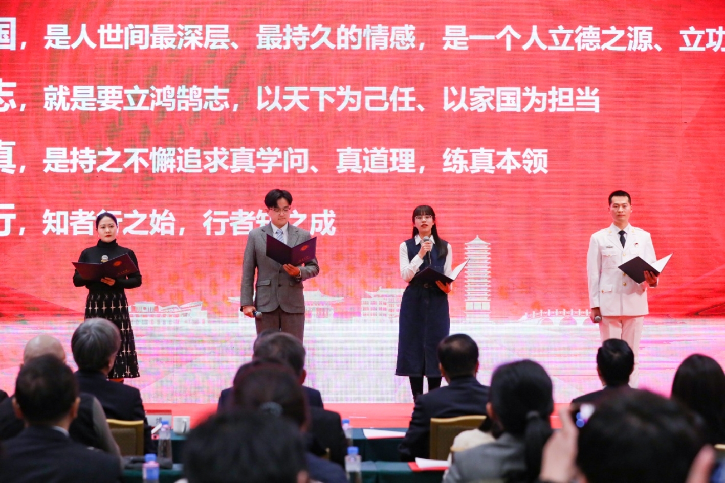 四位獲獎(jiǎng)學(xué)生代表分別以“愛(ài)國(guó)、勵(lì)志、求真、力行”為關(guān)鍵詞講述了自己的故事。哲學(xué)系本科生徐夢(mèng)浩成為驅(qū)逐艦上的導(dǎo)彈號(hào)手,投身火熱軍營(yíng)的經(jīng)歷讓他明白當(dāng)兵首先是家國(guó)責(zé)任;來(lái)自縣城中學(xué)的社會(huì)學(xué)系本科生孟祥婕深入調(diào)研“縣中塌陷”,思考解決之道,為家鄉(xiāng)的發(fā)展盡一份心力;法學(xué)院博士研究生尚博文隨跨學(xué)科團(tuán)隊(duì)赴中東展開(kāi)超過(guò)1400公里的調(diào)研行程,在“一帶一路”國(guó)家留下北大學(xué)子求真探索的足跡;口腔醫(yī)學(xué)院博士研究生朱慧在醫(yī)院里呵護(hù)著“被天使吻過(guò)”的孩子,秉持醫(yī)者的厚道初心,以力行回饋社會(huì)。四位同學(xué)用堅(jiān)定的口吻共同發(fā)出心聲:“我們將砥礪前行,書(shū)寫(xiě)青年奮斗的華彩篇章!”