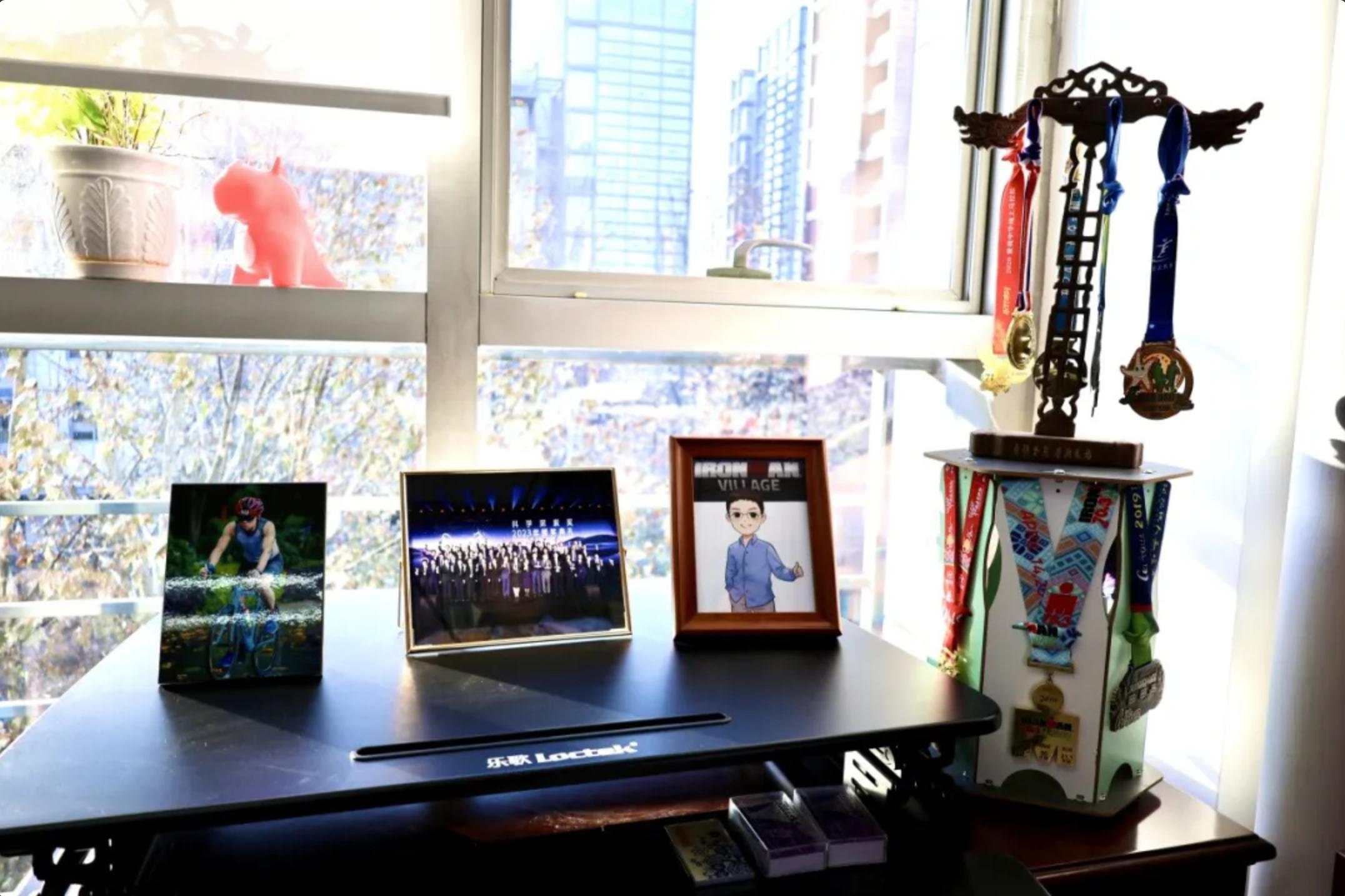 唐杰辦公室里擺放著他參加鐵人三項(xiàng)、馬拉松等比賽的獎(jiǎng)牌和照片