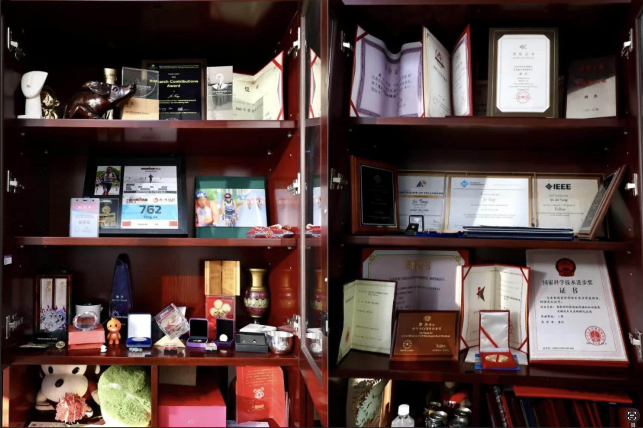 唐杰辦公室內(nèi)書架一角擺滿各類獎(jiǎng)狀和獎(jiǎng)杯