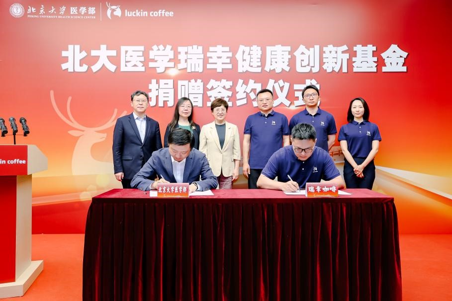 雙方代表簽署《北大醫(yī)學(xué)瑞幸健康創(chuàng)新基金捐贈(zèng)協(xié)議》