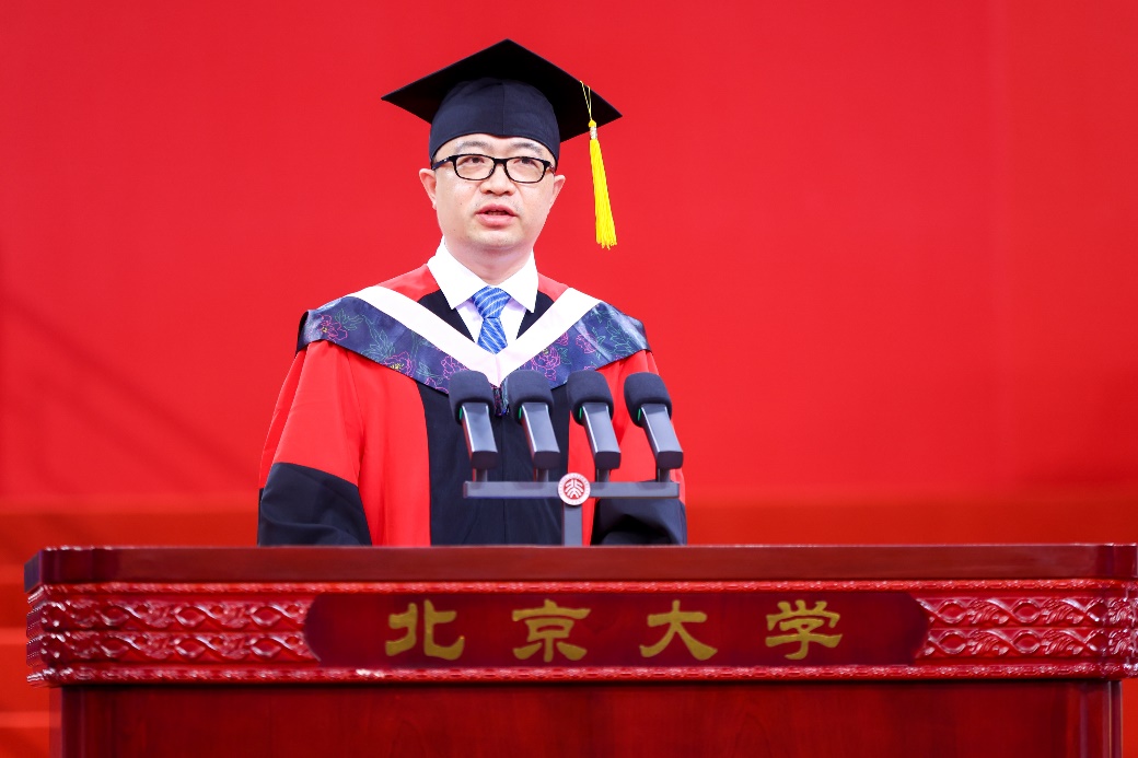 離別之際,作為校長(zhǎng)和校學(xué)位評(píng)定委員會(huì)主席,龔旗煌為畢業(yè)生們送上深情的寄語(yǔ)和美好的祝福。他指出,同學(xué)們?cè)诒贝罅粝铝俗蠲篮玫那啻河洃洠斋@了求知的熱情與學(xué)習(xí)的方法,培養(yǎng)了獨(dú)立思考的習(xí)慣與團(tuán)隊(duì)合作的經(jīng)驗(yàn),更以青春熱情投入北大的發(fā)展建設(shè)中,成為北大新發(fā)展歷程的見(jiàn)證者、推動(dòng)者和貢獻(xiàn)者。他表示,今年是新中國(guó)成立75周年,也是五四運(yùn)動(dòng)105周年。十年前,習(xí)近平總書(shū)記在北大考察時(shí)指出,青年是標(biāo)志時(shí)代最靈敏的晴雨表,每一代青年都有自己的機(jī)遇和機(jī)緣,都要在自己所處的時(shí)代條件下謀劃人生、創(chuàng)造歷史。今天,同學(xué)們即將開(kāi)啟人生新階段,新的時(shí)代使命也在召喚著大家。作為新時(shí)代的新青年,同學(xué)們是承前啟后、繼往開(kāi)來(lái)的一代人,大家的人生理想和價(jià)值追求,將決定中國(guó)式現(xiàn)代化的萬(wàn)千氣象。