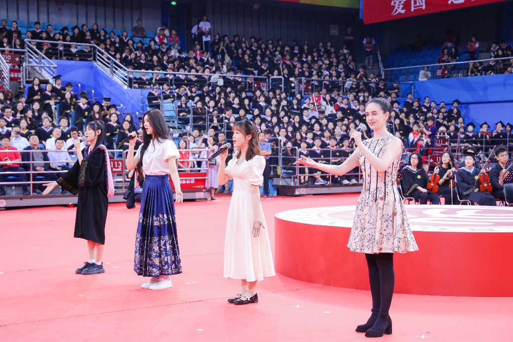 典禮開(kāi)始前,來(lái)自北京大學(xué)附屬幼兒園、學(xué)生交響樂(lè)團(tuán)、學(xué)生舞蹈團(tuán)、學(xué)生合唱團(tuán)和教工合唱團(tuán)的老師、同學(xué)們,以及部分畢業(yè)生代表帶來(lái)了精彩紛呈的歌舞表演,將現(xiàn)場(chǎng)氣氛盡數(shù)點(diǎn)燃。在歌曲《青春大概》的疑問(wèn)中交出答卷,隨著舞蹈《我們的歌》,回溯美好校園時(shí)光。《扇武飛揚(yáng)》,飛揚(yáng)少年壯志;《月光小夜曲》,低吟離別感傷。多語(yǔ)種聯(lián)唱《但愿人長(zhǎng)久》,是對(duì)畢業(yè)生們最真摯的祝福,此去長(zhǎng)風(fēng)萬(wàn)里,愿每一位畢業(yè)生都能《一路生花》。