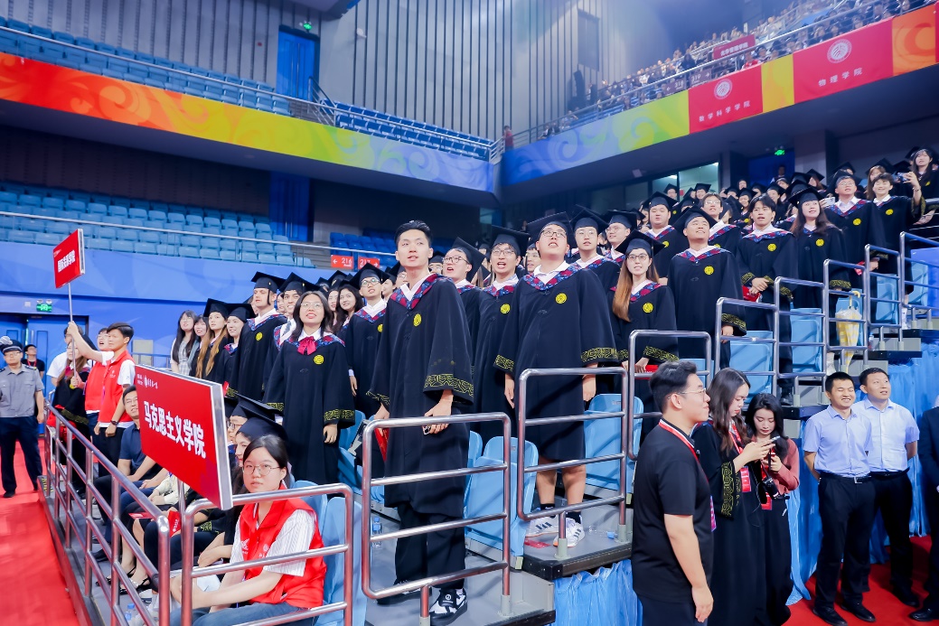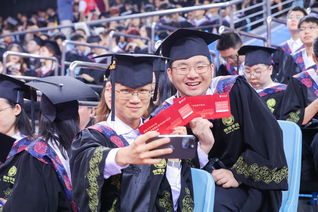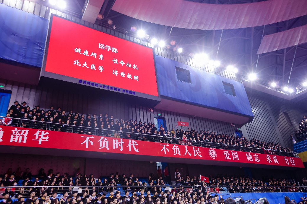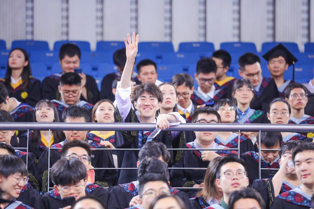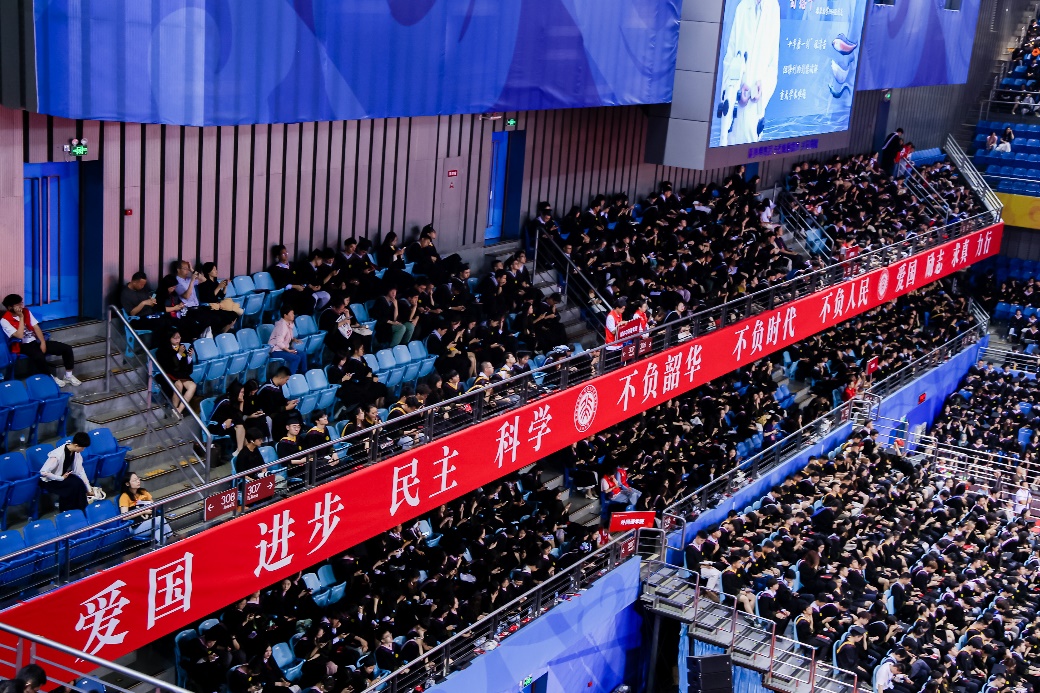 龔旗煌以院系為單位宣布授予2024屆本科畢業(yè)生學(xué)士學(xué)位。各院系畢業(yè)生依次起立,喊出各具專業(yè)特色的畢業(yè)口號(hào):“萬(wàn)卷詩(shī)書(shū)堪用事,一塔湖圖總故鄉(xiāng)” “大學(xué)堂開(kāi),法律門(mén)啟;安邦濟(jì)世,正義恒立”“一馬當(dāng)先,成才報(bào)國(guó)”“化腐朽為神奇,學(xué)宇宙之奧秘”“工道自然成,學(xué)為家國(guó)夢(mèng)”……響亮的口號(hào)回蕩在邱德拔體育館上空,這是畢業(yè)生們對(duì)母校、對(duì)祖國(guó)的莊嚴(yán)承諾,從此,他們與這永遠(yuǎn)的校園血脈相連,也將青春熱血與個(gè)人理想融匯進(jìn)時(shí)代發(fā)展的滾滾洪流之中。