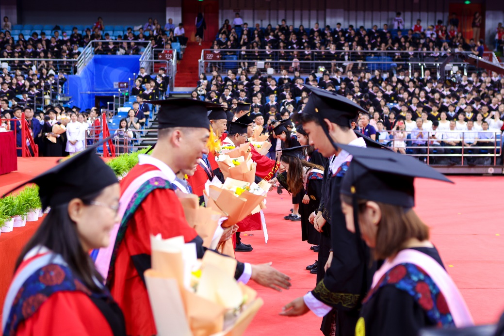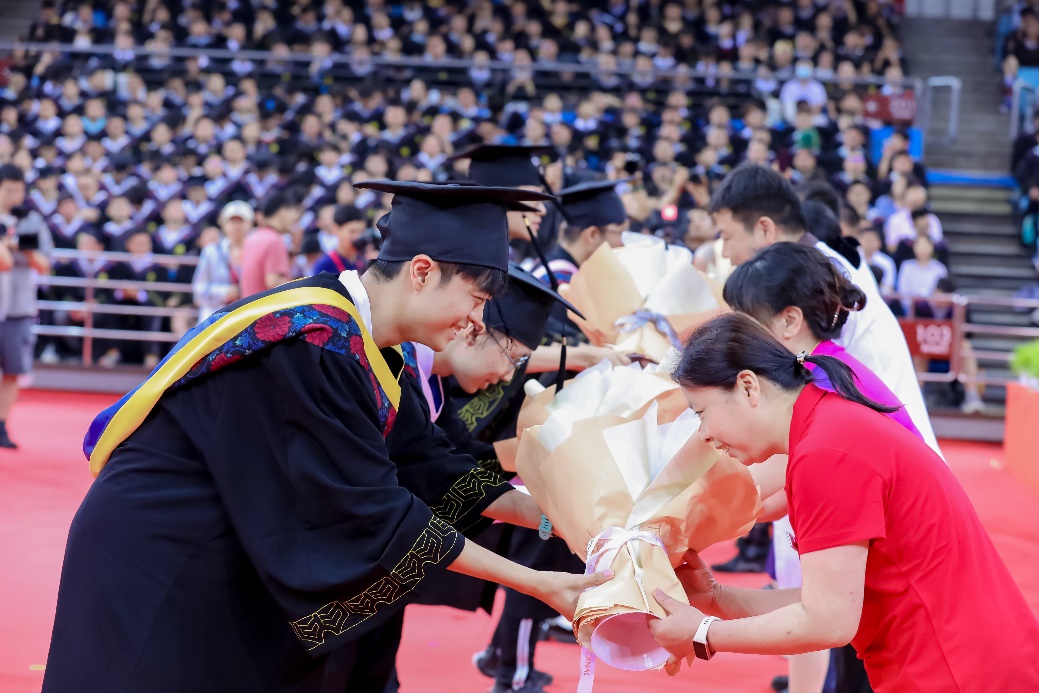 四年間,同學(xué)們的點(diǎn)滴進(jìn)步和成長(zhǎng),都離不開(kāi)學(xué)校教職員工的陪伴與支持。畢業(yè)之際,他們向同學(xué)們送上溫暖的關(guān)懷與真摯的祝福。同學(xué)們感激在心,畢業(yè)生代表向教學(xué)科研及教輔人員、醫(yī)護(hù)人員及抗疫志愿者、保安員、學(xué)生輔導(dǎo)員、廚師及餐飲服務(wù)人員、后勤服務(wù)保障人員代表獻(xiàn)花,感謝他們的辛勤付出。