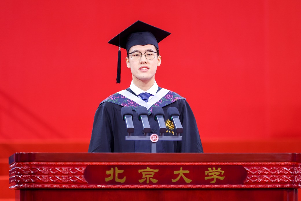 畢業(yè)生代表、數(shù)學(xué)科學(xué)學(xué)院2020級(jí)本科生馮宣瑞是2020年開(kāi)學(xué)時(shí)數(shù)學(xué)科學(xué)學(xué)院第一位報(bào)到的新生,他將自己的大學(xué)四年比作圓周率“π”——看起來(lái)毫無(wú)規(guī)律,卻充滿無(wú)限可能。四年間,他文理兼修,大膽探索,既在攀登數(shù)學(xué)高峰的路上穩(wěn)扎穩(wěn)打,又徜徉于文學(xué)殿堂、觸摸北大人文精神。站在畢業(yè)的路口,他從容而自信地表示,自己將用開(kāi)放的心態(tài)坦然擁抱千變?nèi)f化的生活。