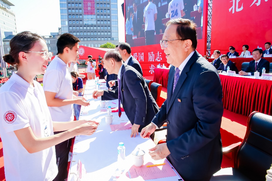 第十屆、十一屆全國(guó)人大常委會(huì)副委員長(zhǎng)、十二屆全國(guó)政協(xié)副主席韓啟德院士和來(lái)自海淀、昌平、密云區(qū)委區(qū)政府的相關(guān)領(lǐng)導(dǎo)同志,北京大學(xué)黨委書(shū)記郝平、校長(zhǎng)龔旗煌等學(xué)校領(lǐng)導(dǎo)班子成員,理學(xué)部主任謝曉亮院士,哲學(xué)社會(huì)科學(xué)一級(jí)教授、人文學(xué)部主任申丹,生命科學(xué)學(xué)院趙進(jìn)東院士,現(xiàn)代農(nóng)學(xué)院張改平院士,化學(xué)與分子工程學(xué)院席振峰院士,工學(xué)院魏悅廣院士,工學(xué)院院長(zhǎng)段慧玲院士,第三醫(yī)院董爾丹院士,哲學(xué)社會(huì)科學(xué)一級(jí)教授、歷史學(xué)系閻步克,哲學(xué)社會(huì)科學(xué)一級(jí)教授、法學(xué)院陳興良,以及各院系、職能部門負(fù)責(zé)人出席。開(kāi)學(xué)典禮由副校長(zhǎng)、教務(wù)長(zhǎng)王博主持。