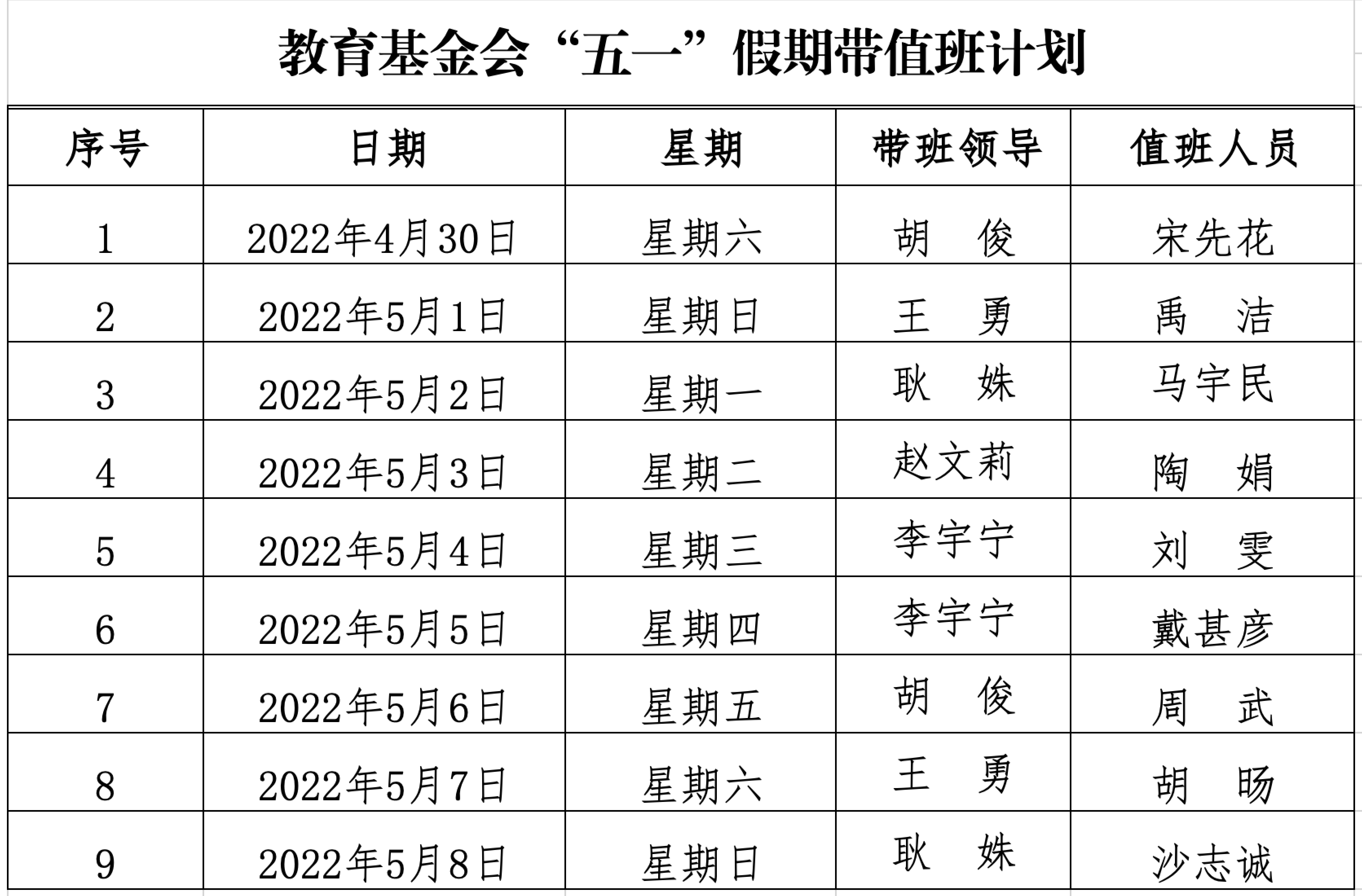 北京大學(xué)教育基金會2022年“五一”假期帶值班計劃公布如下: