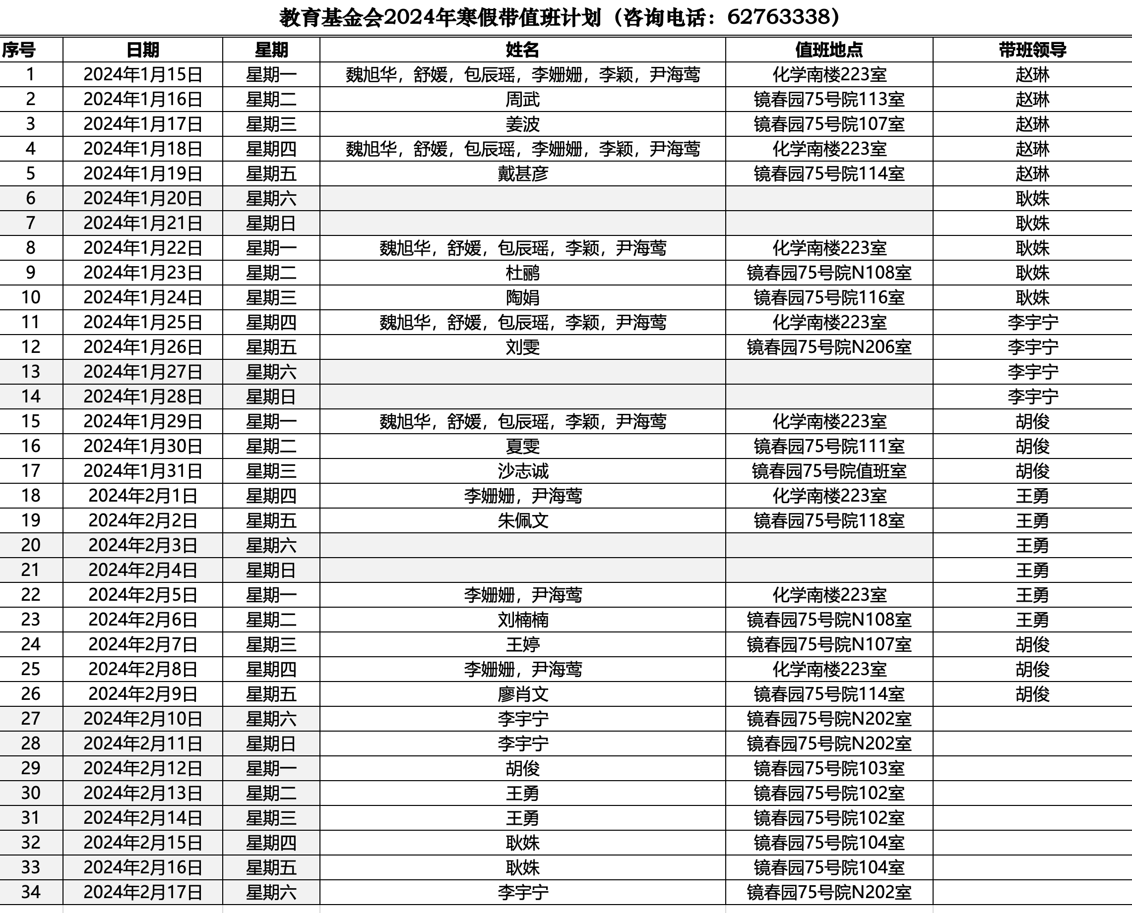根據(jù)學(xué)校《關(guān)于做好寒假和春節(jié)期間工作的通知》,北京大學(xué)教育基金會(huì)現(xiàn)將2024年寒假帶值班計(jì)劃公布如下: