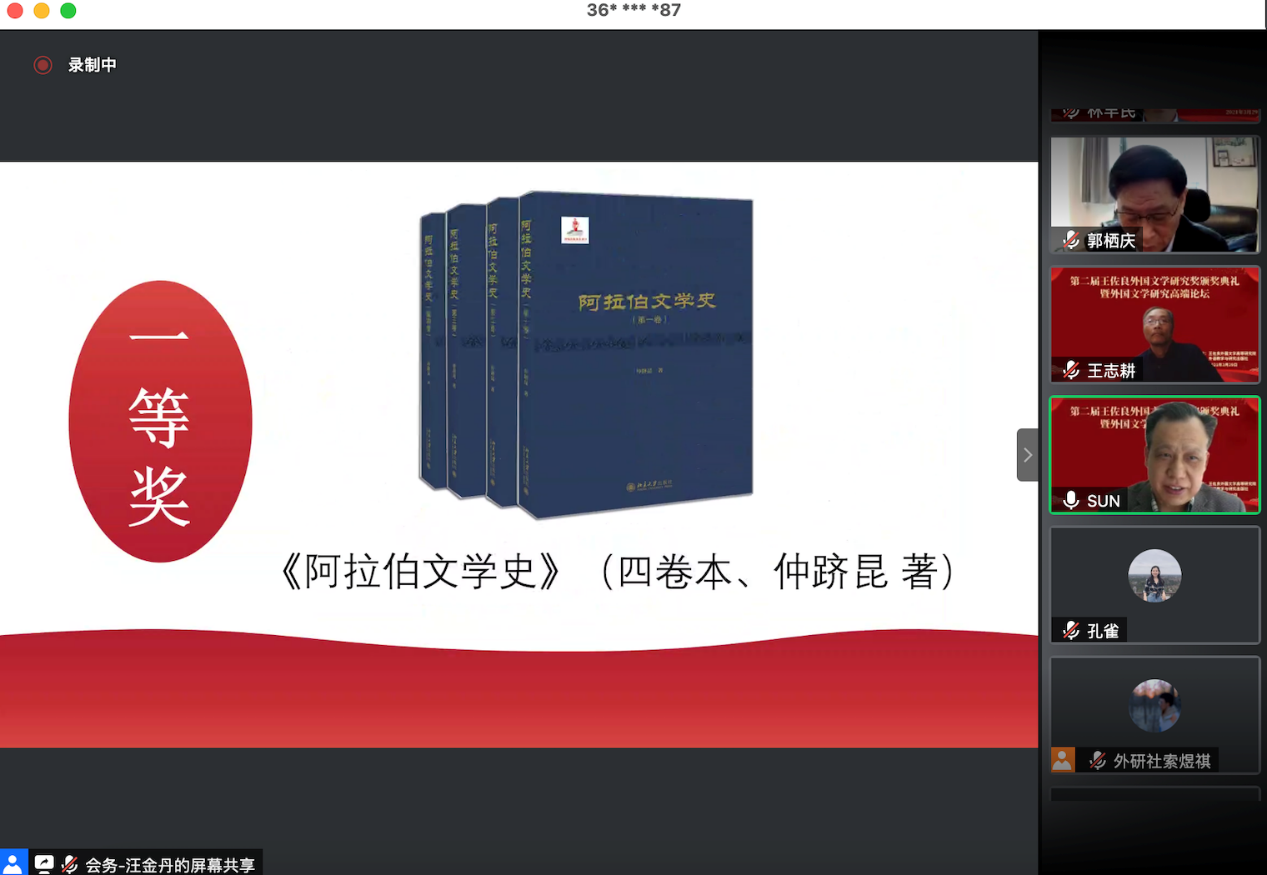王佐良外國文學高等研究院院長、評獎委員會主席金莉教授介紹了評選工作的開展情況,60名初評專家選出了16部作品進入第二輪評選,最終8部作品進入終評,第三輪的終評專家又經過三輪投票最終確定獲獎名單。仲躋昆教授撰寫的《阿拉伯文學史》摘得本屆大獎的桂冠。