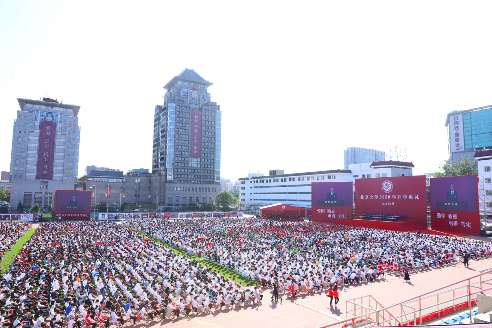 秋日的燕園,天高云淡,氣候宜人,未名湖畔書聲瑯瑯,綠地、白椅映襯著北大紅,古樸的燕園恢復了勃勃生機。9月20日上午,北京大學2020年開學典禮在五四體育場舉行。2020級本科、碩士、博士新生匯聚在一起,為有著120多年輝煌歷史的北大注入了新的活力。