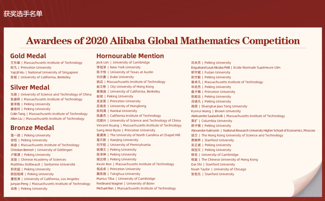 7月2日,第二屆阿里巴巴全球數(shù)學(xué)競(jìng)賽舉行線上頒獎(jiǎng)典禮。在決賽的73名獲獎(jiǎng)?wù)咧校?0位北大數(shù)學(xué)人,占比41%。在22位金銀銅獎(jiǎng)的得主中,北大數(shù)學(xué)人占據(jù)其中12席,占比過(guò)半。4位金獎(jiǎng)得主中,有3位北大人。