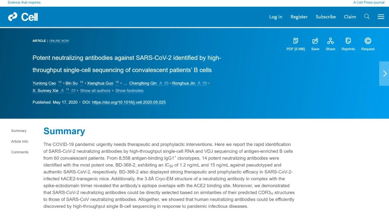 近日,Cell在線發(fā)表了北京大學北京未來基因診斷高精尖創(chuàng)新中心(ICG)謝曉亮課題組與合作團隊的文章。文章題為“Potent neutralizing antibodies against SARS-CoV-2 identified by high-throughput single-cell sequencing of convalescent patients’B cells”,公布了其新型冠狀病毒強效藥研究的最新重要進展。
