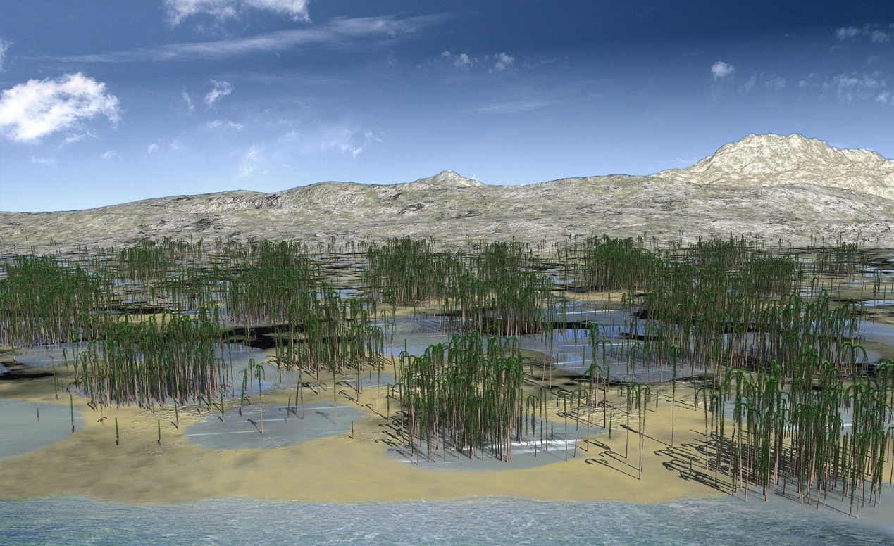 泥盆紀新杭森林景觀復原圖。森林由小型石松樹木——廣德木(Guangdedendron)組成,分布在晚泥盆世熱帶的濱海岸邊(鄧珍珍等繪制)