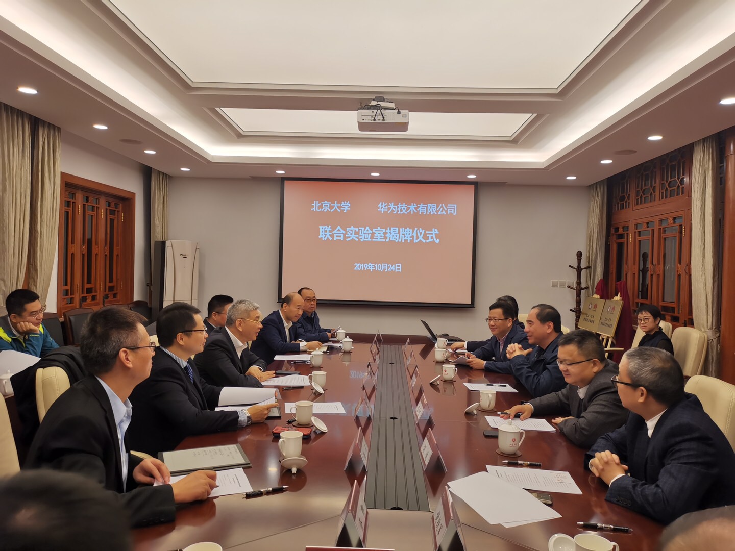 會見結(jié)束后,雙方在臨湖軒舉辦了聯(lián)合實(shí)驗(yàn)室揭牌儀式。龔旗煌和徐文偉共同為“北大-華為智能媒體聯(lián)合實(shí)驗(yàn)室”和“北大-華為數(shù)學(xué)聯(lián)合實(shí)驗(yàn)室”揭牌。兩個聯(lián)合實(shí)驗(yàn)室主任黃鐵軍教授和胡俊教授分別就實(shí)驗(yàn)室工作計劃和研究進(jìn)展作了交流。