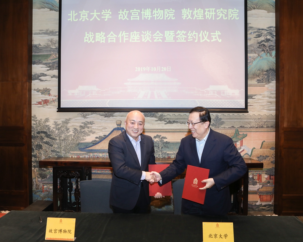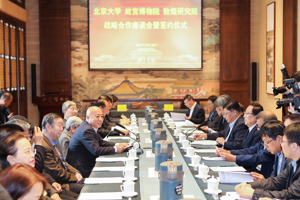 2019年10月20日下午,北京大學(xué)與故宮博物院、敦煌研究院在故宮博物院建福宮花園敬勝齋召開戰(zhàn)略合作座談會,并簽署戰(zhàn)略合作協(xié)議,深入開展文物保護(hù)與研究、人才培養(yǎng)等工作。北京大學(xué)黨委書記邱水平、校長郝平,故宮博物院院長王旭東,北大校友、敦煌研究院名譽(yù)院長樊錦詩,敦煌研究院院長趙聲良,以及專家學(xué)者和媒體代表出席座談會。
